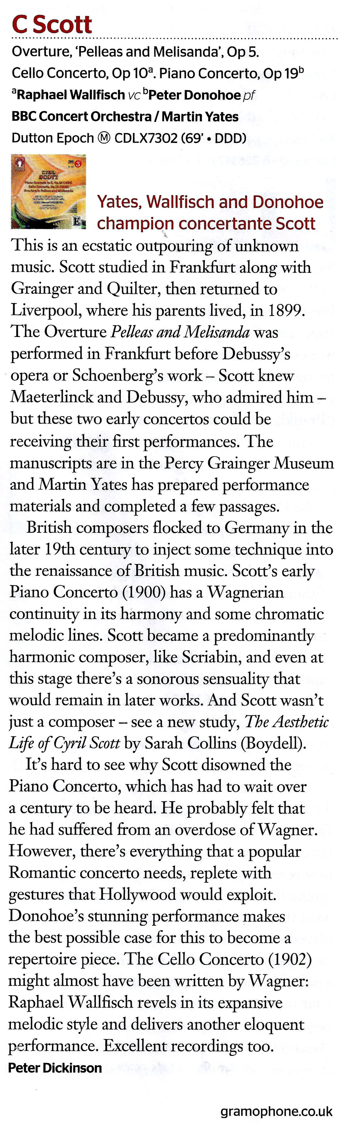 There’s quite a bit of reconstructive work behind the present CD its anthology of rare early Scott. The revisions, realisations and completions are by Martin Yates and the editing of the solo cello part is by Raphael Wallfisch. Yates is no stranger to such projects as we know from his Moeran Symphony No. 2 and the recently issued Bax symphony in F.